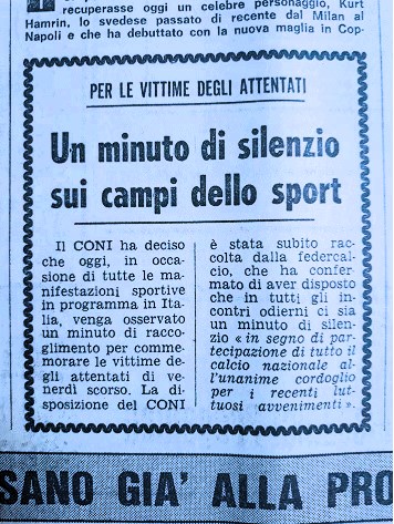 Il calcio italiano, davanti alla strage, non si ferma. Nessuna sospensione del campionato, nessun segnale forte: soltanto un minuto di silenzio. La partita non si gioca solo perché una nebbia fitta avvolge Milano e rende impossibile scendere in campo. Il rinvio è tecnico, non morale.