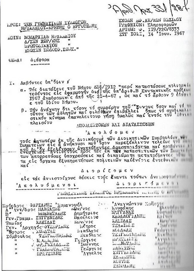 Pochi mesi dopo, a fine stagione, la squadra viene retrocessa d’ufficio e relegata ai campionati dilettantistici. La legge imponeva che solo una squadra professionistica potesse rappresentare ogni città: la scelta favorisce i rivali dell’Ofi, che possono così prendere i migliori giocatori dei giallo-neri. La dirigenza viene smantellata, gli appelli ignorati e l’Ergotelis, fino a quel momento simbolo di apertura e modernità, sembra destinata a sparire.