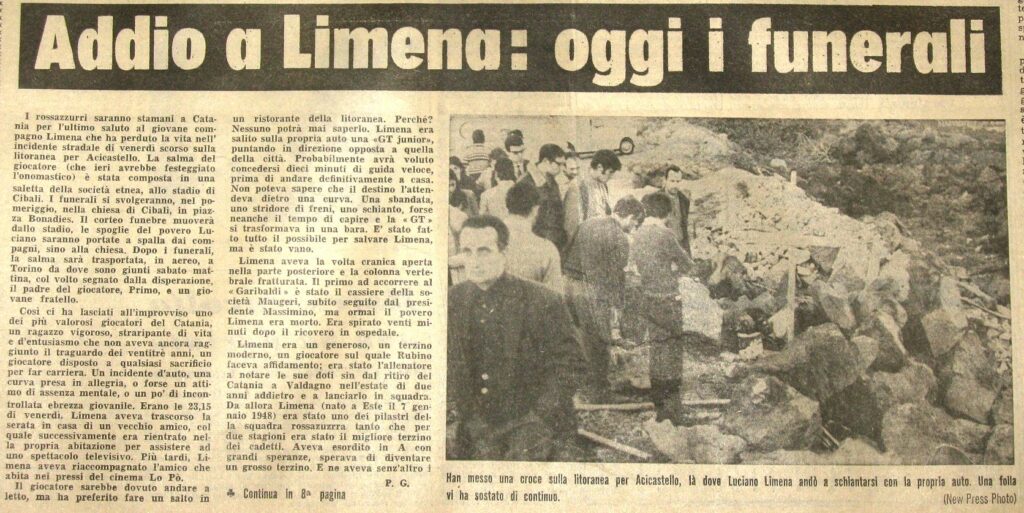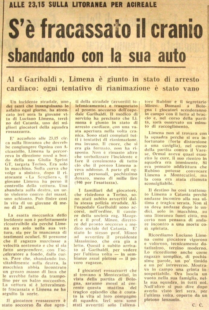 L’11 dicembre 1970, poco dopo le undici di sera, Luciano Limena guida lungo il litorale di Catania in direzione di Aci Castello. È solo nella sua Alfa Romeo Giulia Sprint GT. Ha appena lasciato un amico, dopo una serata trascorsa davanti alla televisione. Niente lascia presagire che quello sarà l’ultimo tratto della sua strada.