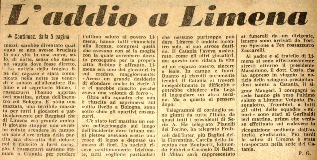 La notizia corre veloce e raggiunge Bologna, dove il Catania deve scendere in campo. La squadra gioca immersa in un silenzio pesante, con il dolore addosso. Subito dopo, il ritorno in Sicilia per partecipare al funerale.