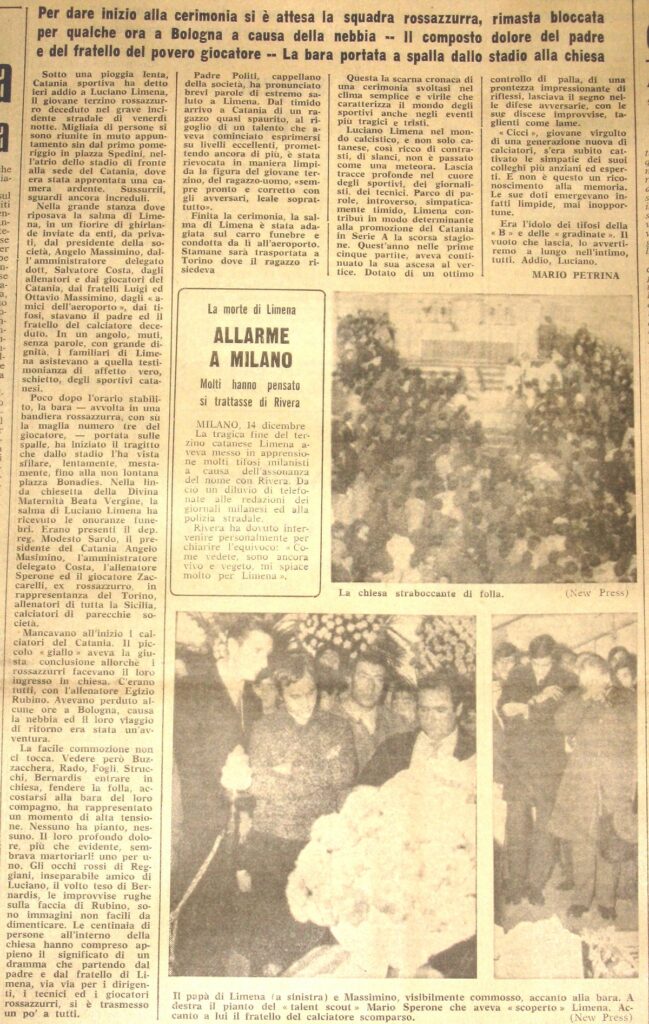L’ultimo saluto si svolge nella chiesa di Piazza Bonadies. Arrivano i familiari dal Nord, la dirigenza rossazzurra è presente al completo, con il presidente Angelo Massimino visibilmente provato. La città risponde in massa, stringendosi attorno a un ragazzo che aveva già conquistato tutti.