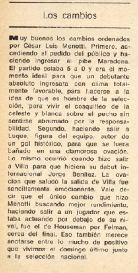Il ragazzo partì dalla panchina, il cuore che batteva a mille, e attese il momento giusto. Il fischio del secondo tempo segnò l’ingresso in campo: Maradona rilevò Leopoldo Jacinto Luque al minuto 20, sotto lo sguardo attento di un pubblico curioso e già affascinato da quel nome. La rivista El Gráfico descrisse così il momento: “Molto azzeccati i cambi ordinati da Menotti. Prima, accontentando il pubblico, facendo entrare il pibe Maradona. Il match era 5-0 e quell’istante era perfetto per un debutto senza pressioni, per sentire il brivido della celeste e bianca sul petto senza esserne schiacciati”.